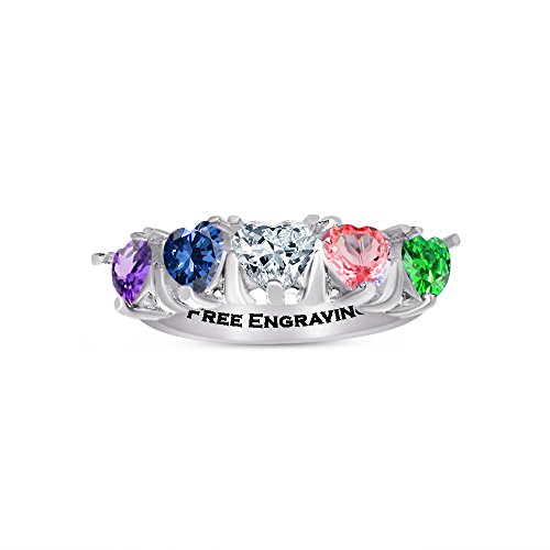 Unique Free Engraving - Personalized Sterling Silver 5 Heart Mother Simulated BirthStone Band Pick Your Own Cz Color Stones At No Extra Cost