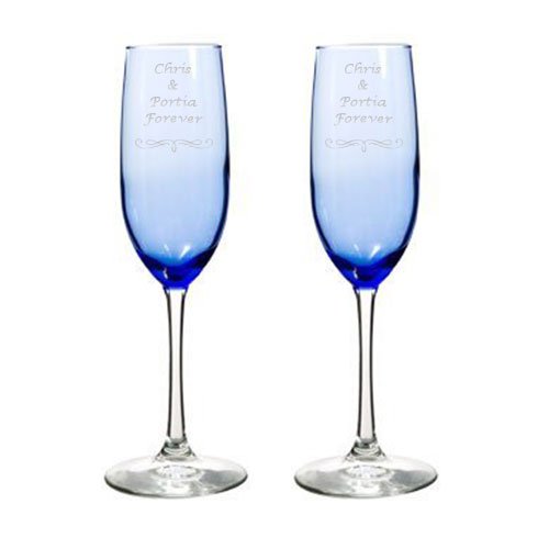 2 Engraved Wedding Blue Glass Champagne Flutes Personalized Toasting Glasses