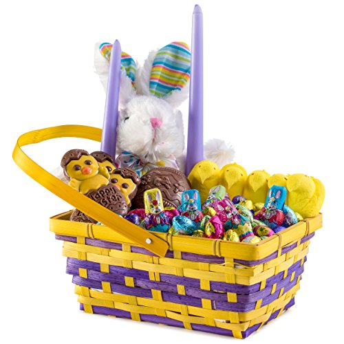 Benevelo Gifts Happy Easter Deluxe Wooden Gift Basket incl. Plush Bunny, Peeps Candy, Chocolates & Other Delicious Candles - Beautiful Woven Design with Bow - Ideal as a Springtime or Easter Present