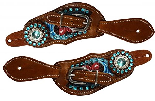 Showman Youth Size Floral Tooled Leather Spur Straps with Metallic Paint and Aqua Blue Crystals.