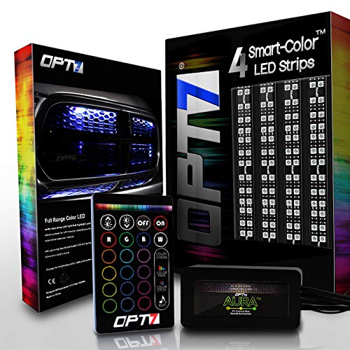 OPT7 Aura 4pc PRO LED Lighting Kit for Grille | 24" Multi-Color Strips w/SoundSync - Dimmer, Fade, Strobe, Sound-activated - Waterproof Peel'n'Stick Front Grill Valence