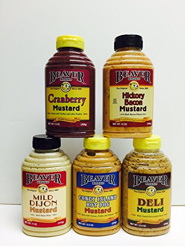 Beaver Brand Squeezed Mustard Mixed 5 Packs – Mild Dijon Mustard, Hickory Bacon Mustard, Coney Island Hot Dog Mustard, Deli Mustard, and Cranberry Mustard