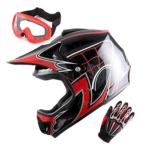 Motocross MX BMX Bike Youth Spider Red Helmet (Size: Medium) + Goggle + Skeleton Glove (Size: X-Small)