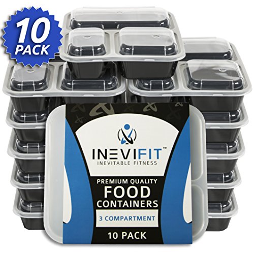 INEVIFIT Meal Prep 3 Compartment BPA FREE, Premium Food Storage Containers, Durable & Reusable, 36 oz. Stackable 10 Pack, Microwaveable & Dishwasher Safe Bento Lunch Box with Leak Resistant Technology