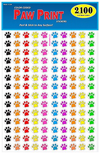 Pack of 2100 Colorful Dog Paw Print Stickers, ¾ inch, 8 Bright Neon Colors, Great for Teachers, Classrooms & Veterinarians!