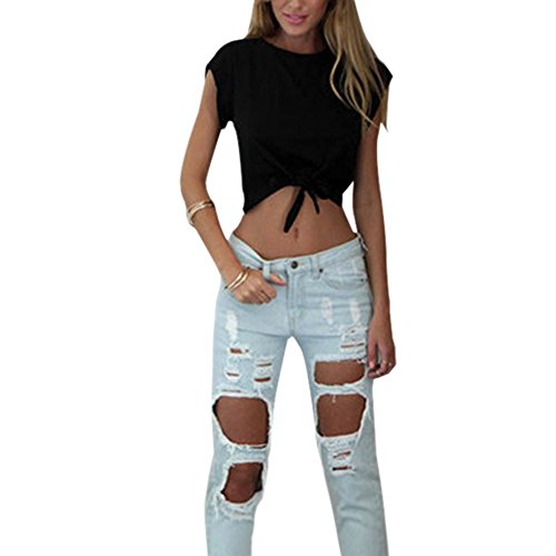 EFINNY Women Summer Tie Front Short Sleeve Tank Tees DAW Navel Round Neck Crop Top