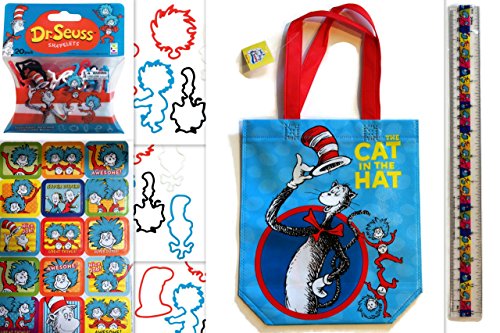 Dr. Seuss Tote Bag Bracelets, Ruler and Sticker Set - Cat in the Hat Tote Bag, Plus 20 Piece Assorted Bracelet Bandz, Ruler and Sticker Sheet