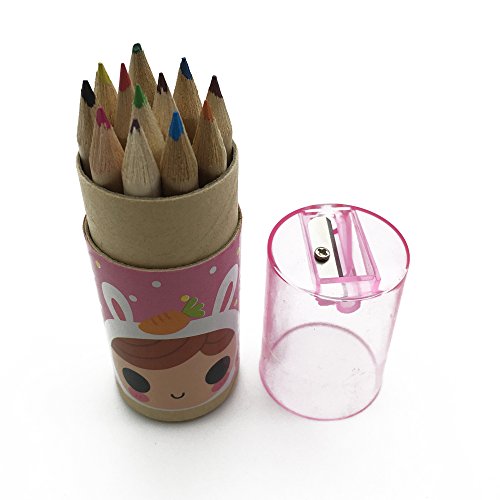 Mziart Mini Wooden Colored Pencils/ Drawing Pencils for Kids (Set of 12 Assorted Colors + 1 Sharpener, 3.5” Length, Pink Lid)