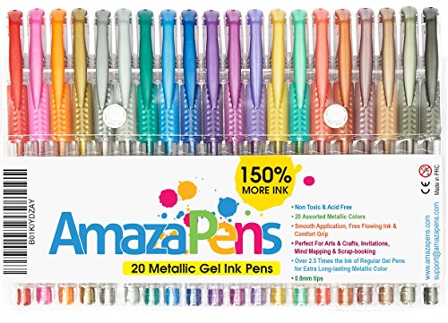 AmazaPens Gel Pens 20 Metallic Top Quality Coloring Pens with Storage Case | 150% More Ink Than Other Gel Ink Pen Sets | Best for Adult Coloring Books and Art & Craft Use