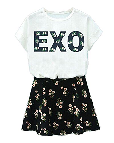 KPOP EXO Baekhyun Chanyeal Sehun Printed T-Shirt + Floral skirt Two Piece Suit