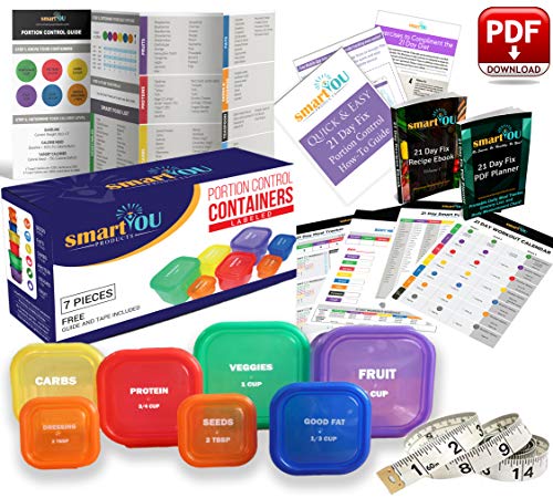21 Day Portion Control Containers Kit - Nutrition Diet, Multi-Color Coded Weight Loss System. Complete Guide + PDF Planner + Recipe eBook and Tape Measure - BPA Free - 7 PC Labeled