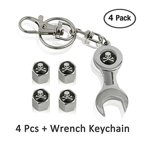 Valve Stem Caps, Ampper Chrome MMJ Skull Style Tire Valve Stem Caps, Car Rubber Wheel Tyre Valve Stem Stainless Steel Cover Set + Wrench Keychain (Pack of 4)