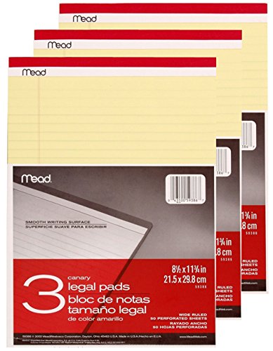 Mead Legal Pad, 8-1/2 x 11-3/4 Inches, Perforated, Canary, Legal/Wide Rule, 50 Sheets per Pad, 3 Pads per Pack, 3 PACK = Total 450 Sheets
