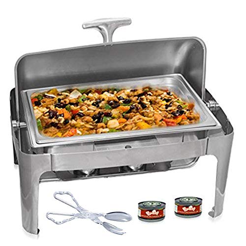 Tiger Chef Stainless Steel Roll Top Chafer, 8 Quart Chafing Dish Set with 2 Fuel Gels Burns 2.5 Hours and a Plastic Salad Tong