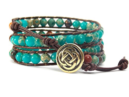 Carolyn Jane's Jewelry Celtic Knot Bracelet Leather Wrap with Mixed Beads Synthetic-Turquoise and Synthetic-Jasper