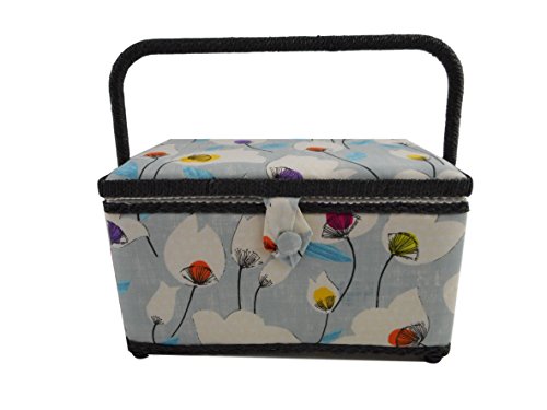 Medium Rectangle Sewing Basket Box with Tray Pincushion 11"x7"x6.5" (Medium 11"X7"X6.5", Light Blue with White Tulips)
