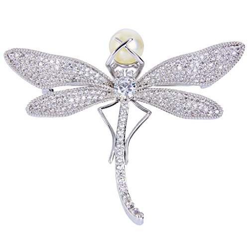 EVER FAITH Silver-Tone Austrian Crystal Cream Simulated Pearl Dragonfly Insect Brooch Clear