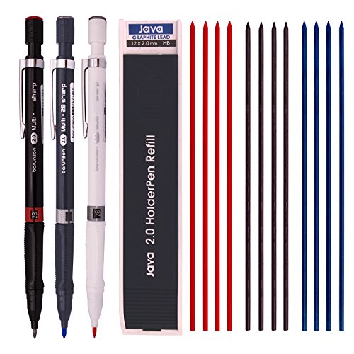 Barunson 2.0 mm Lead Holder Pen Mechanical Pencil for Draft Drawing,Carpenter,Crafting, Art Sketching Sharpener (Pack of 3 Pens) + (2.0mm Hb Lead 1 Tube-Red 4+Blue 4 + Black 4=12 Leads)