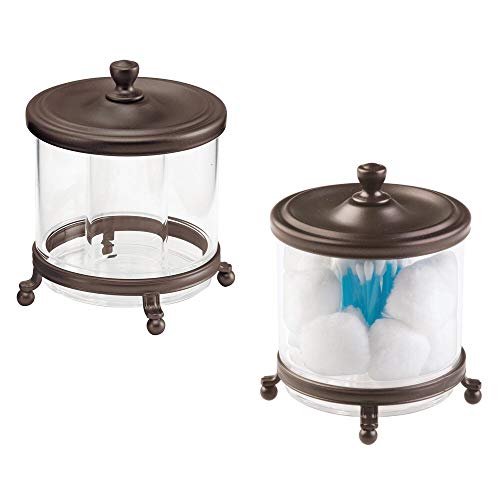 mDesign Round Bathroom Vanity Countertop Divided Storage Canister Plastic Jar with Metal Lid for Cotton Swabs, Rounds, Balls, Makeup Sponges, Blenders, Bath Salts - Clear/Bronze