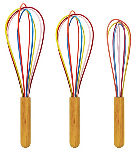 Gogogu 3 Pack Colorful Silicone Whisk with Wooden Handle, Balloon Whisk Set, Egg Frother, Milk and Egg Beater Blender, Kitchen Utensils for Blending, Whisking, Beating, Stirring