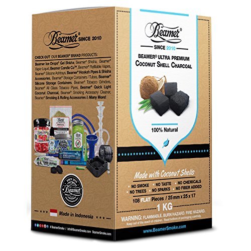 Beamer 100% Natural Coconut Shell Hookah Shisha Charcoal 1 Kilo (Kg) 108 Piece Flats. 25mm X 25 X 17. No Chemicals, No Taste, No Sparks,or Smoke! Coals