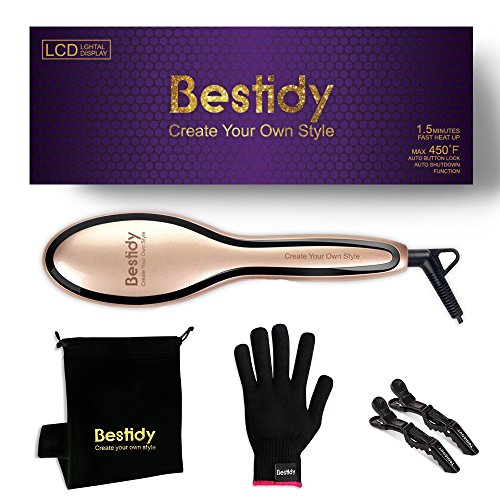 Bestidy Hair Straightener Brush Electrical Heated Brush Ceramic Comb Hair Care, 30-min Auto Shut Off Protection Features, LCD Display & Push Button Temperature Change(450℉/230℃) (Golden)