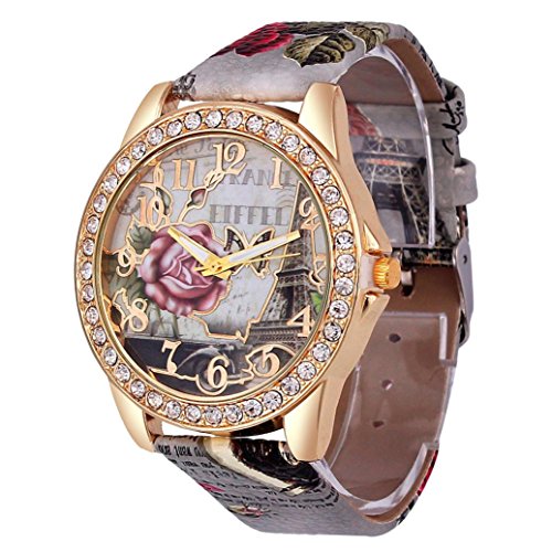 Omita® Women Elegant Rose Pattern Bling Rhinestone Leather Band Analog Quartz Vogue Wrist Watches (Gray)