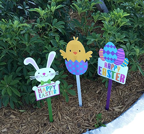 Easter outdoor décor yard stakes decoration Bundle set. Bundle includes 3 piece:Bunny Happy Easter, Egg hunt Happy Easter Chick and Egg hunt
