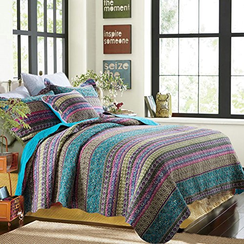 XQL Cotton Boho Stripe 3 Pieces Quilt Set (1 Quilt and 2 Pillow Shams) Queen Size Blue