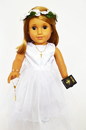 COMMUNION GOWN WITH GREEN FLORAL WREATH -BIBLE-SHOES-CROSS NECKLACE-TIGHTS-ROSARY FOR AMERICAN GIRL DOLLS