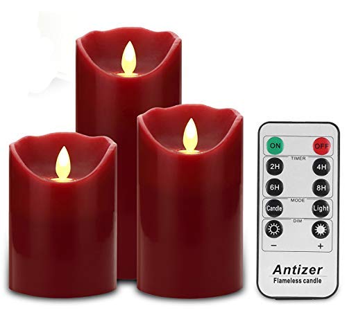 Antizer Flameless Candles 3 Pack Set Drip-Less Real Wax Pillars Include Realistic Dancing LED Flames and 10-Key Remote Control with 24-Hour Timer Function 400+ Hours by 2 AA Batteries (Burgundy)