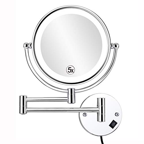 ALHAKIN 8-Inch Wall Mount Makeup Mirror Lighted Bathroom Mirror with 5X Magnification,LED Light, Nickel Finish,UL Listed