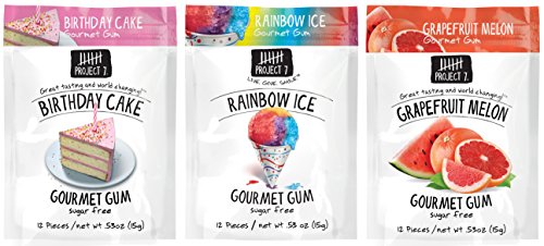 Project 7 Gourmet Sugar Free Gum 3 Flavor Variety Bundle, Birthday Cake, Rainbow Ice, Grapefruit Melon, 15g Each Pack of 3