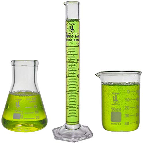 Beaker, Flask, Cylinder Set, 3.3 Borosilicate Glass - 3 Pieces - 50ml Beaker, 50ml Flask and 10ml Cylinder, Karter Scientific 215M2