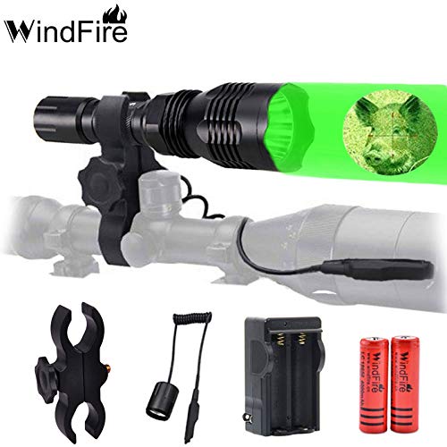 WINDFIRE WF802 Waterproof 350 Lumens 250 Yards Green Cree LED Coyote Hog Fox Predator Varmint Hunting Light Kit with Remote Pressure Switch & Scope/Bike Mount Holder & Spare 18650 Battery and Charger