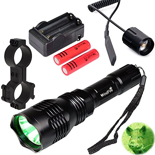 WindFire WF802 350 lumens Green Light Hunting Kit Waterproof 250 Yard Cree LED Coyote Hog Fox Predator Varmint Flashlight with Remote Pressure Switch & 1" Scope Mount & Spare 18650 Battery and Charger