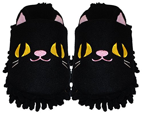 HomeIdeas Women's Plush Cute Animal Microfiber Mop Cleaning House Slippers, Shoes For Women 8-9 (L, Black Cat)