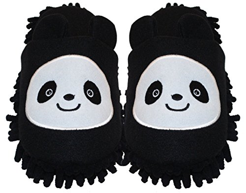 HomeIdeas Women's Plush Cute Animal Microfiber Mop Cleaning House Slippers, Shoes For Women 8-9 (L, Black/White Panda)