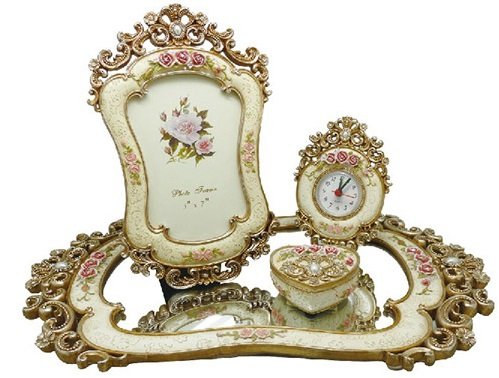Elegant and Charming 4 Piece Perfume Vanity Set with Pearls Set Includes a Mirrored Tray, Photo Frame, Clock, and Jewelry Box