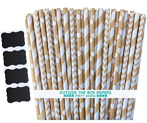 Paper Straws - Kraft Brown and White - Stripe Chevron Polka Dot - Pack of 75 - Outside the Box Papers Brand