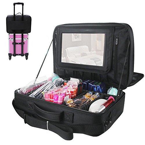 Relavel 3 layer Multi -Functional Professional Makeup Train Case Super Large Makeup bag Organizer for Brush Hair Curler Salon Nail Beauty tool Attach to Trolley With Mirror (brown)