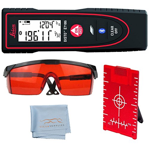 Leica Disto E7100i Laser Distance Measurer, 200-Feet, Black/Red - Red Laser Glasses for Distance Meters - Red Magnetic Floor Target Plate with Stand - Tiger Supplies Cleaning Cloth