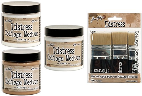Ranger - Tim Holtz Distress Collage Mediums Bundle of 4 Items - Crazing, Vintage and Matte Full-Size Set Plus Brushes