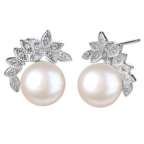 EleQueen 925 Sterling Silver CZ AAA Button Cream Freshwater Cultured Pearl Leaf Bridal Stud Earrings (10mm)