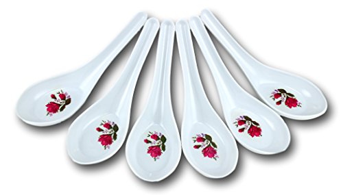 Commercial Grade Asian Soup Spoons - Ramen, Soba, Won Ton Melamine Spoon Set by bogo Brands (6, Red Flower)