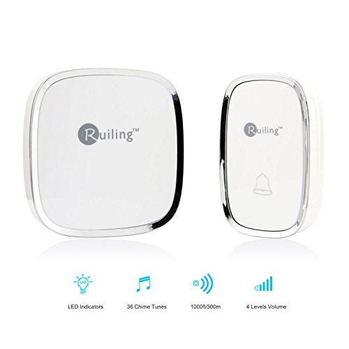 RuiLing Smart Wireless Remote Doorbell Set,1000 Feet Operating Range,36 Optional Stereophonic Music Chimes,4 Level Adjustable Volume Settings and Flashing LED Indicators,Plug-in Receiver - White