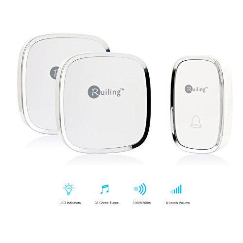 RuiLing Wireless Doorbell Kit,1 Remote Push Button and 2 Plugin Door Chimes 1000 Feet Operating Range, 36 Optional Stereophonic Music Chimes,4 Level Adjustable Volume Settings - White