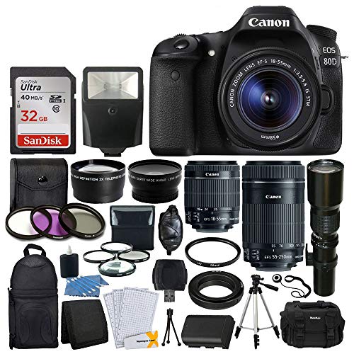 Canon EOS 80D DSLR Camera Body + Canon EF-S 18-55mm + Canon EF-S 55-250mm Lens & Telephoto 500mm f/8.0 (Long) + Wide Angle Lens + 58mm 2X Lens + Macro Filter Kit + 32GB Memory Card + Accessory Bundle