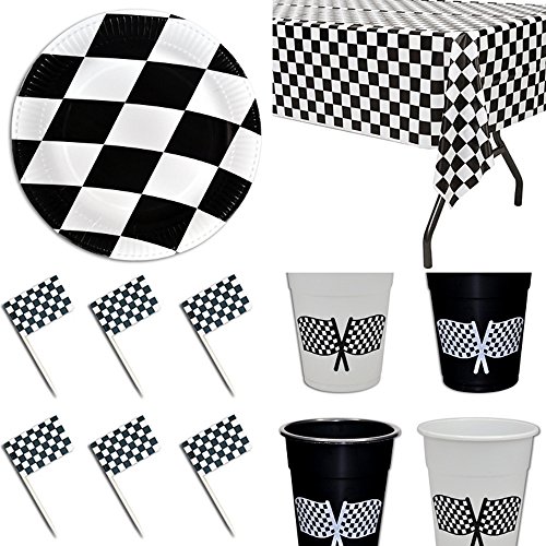 Racing Party tableware - 12 plates - 12 plastic cups - checkered table cover - 144 racing picks