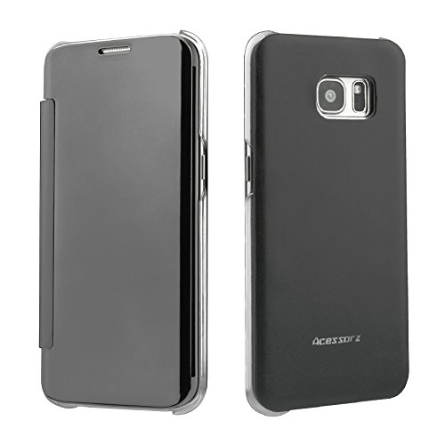 Galaxy S7 Edge Case, Acessorz Fashion Luxury Glossy Mirror Clear View Smart Date/Time Premium [Hyperbolic Mirror] PC Wallet Flip Case Cover for Samsung Galaxy S7 Edge (Black)